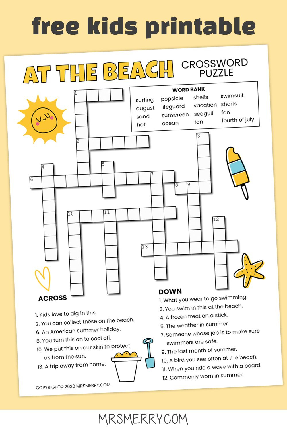 Beach Printable Crossword Puzzle For Kids Mrs Merry Word Puzzles